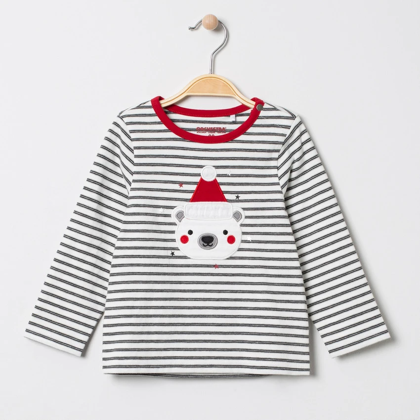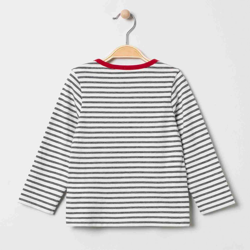 T-shirt manches longues à rayures all-over. Ours brodé devant. Encolure ronde rouge pressionnée sur le côté.