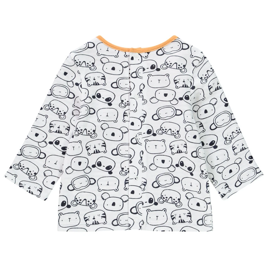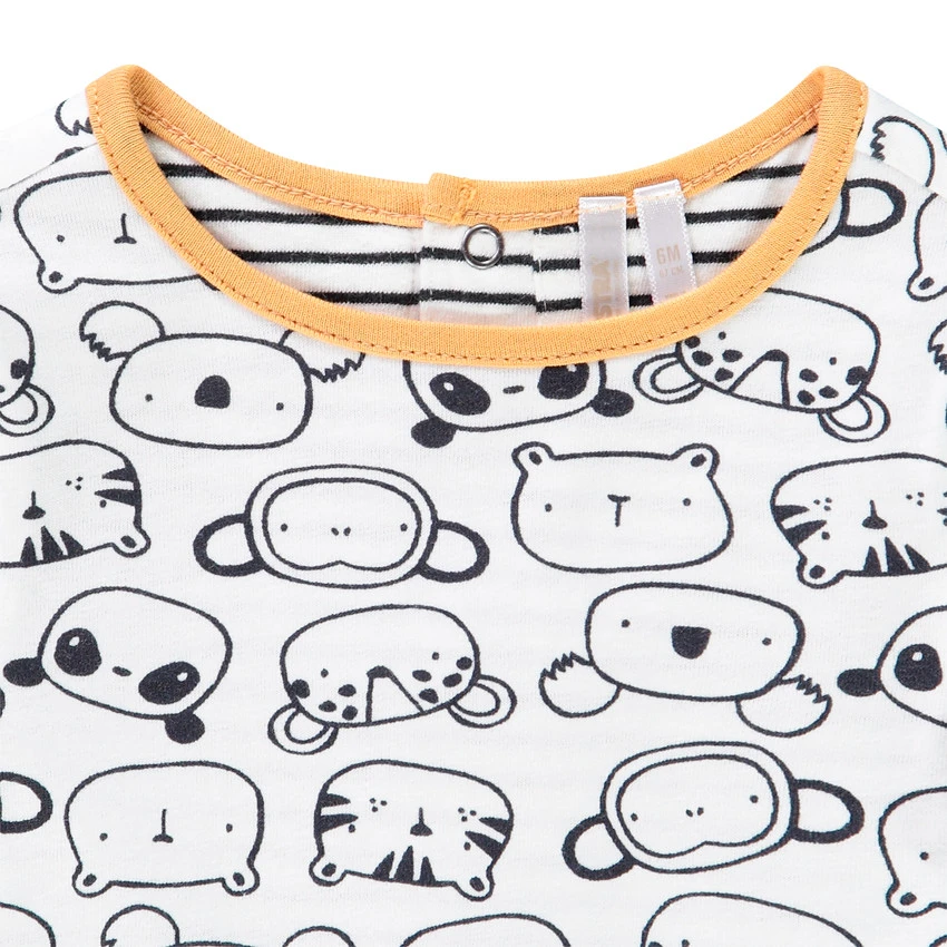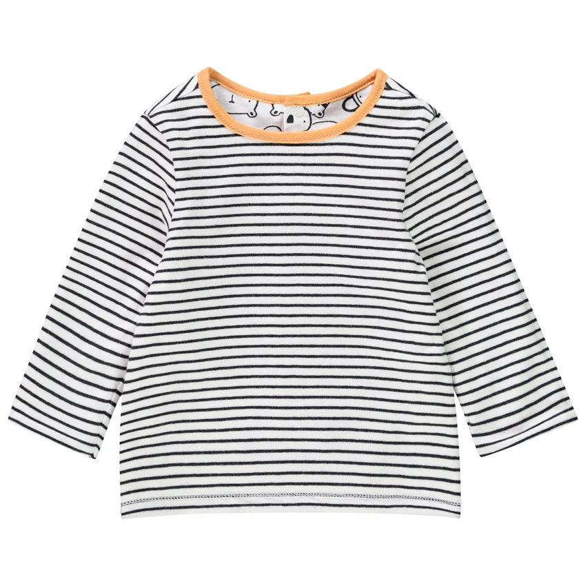 T-shirt manches longues réversible imprimé animaux d’un côté et rayé de l’autre. Coton issue de l’agriculture biologique pour préserver la peau et l’environnement. Col rond en maille extensible finition biais contrasté. Ouverture pressionnée au dos pour faciliter l’habillement.