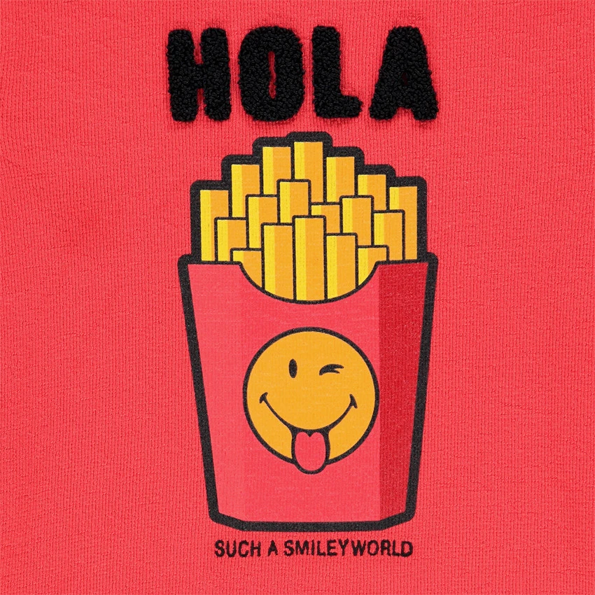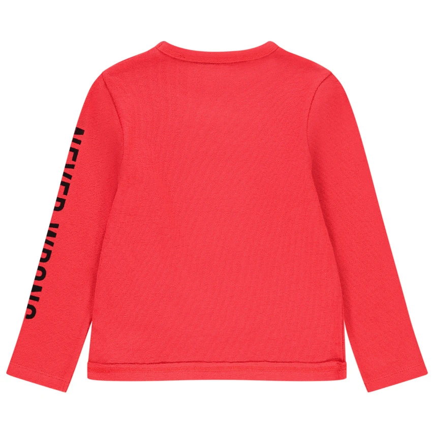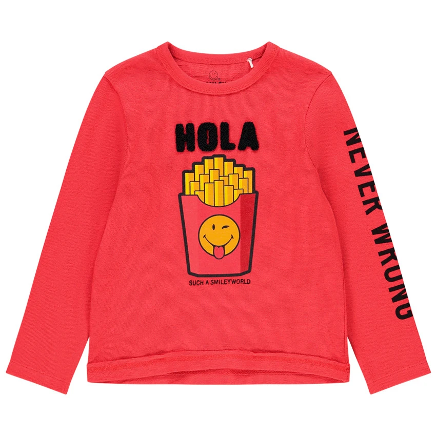 T-shirt manches longues en coton rouge. Col en maille extensible pour l’enfiler facilement. Message en bouclette et print SmileyWorld sur le devant. Message printé sur la manche gauche. Dos uni.
