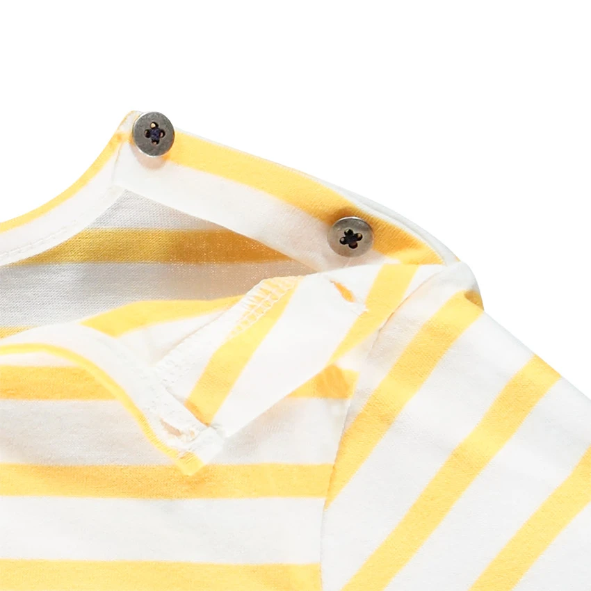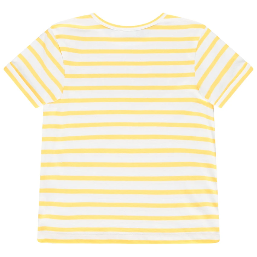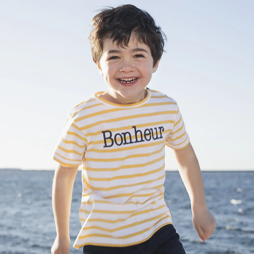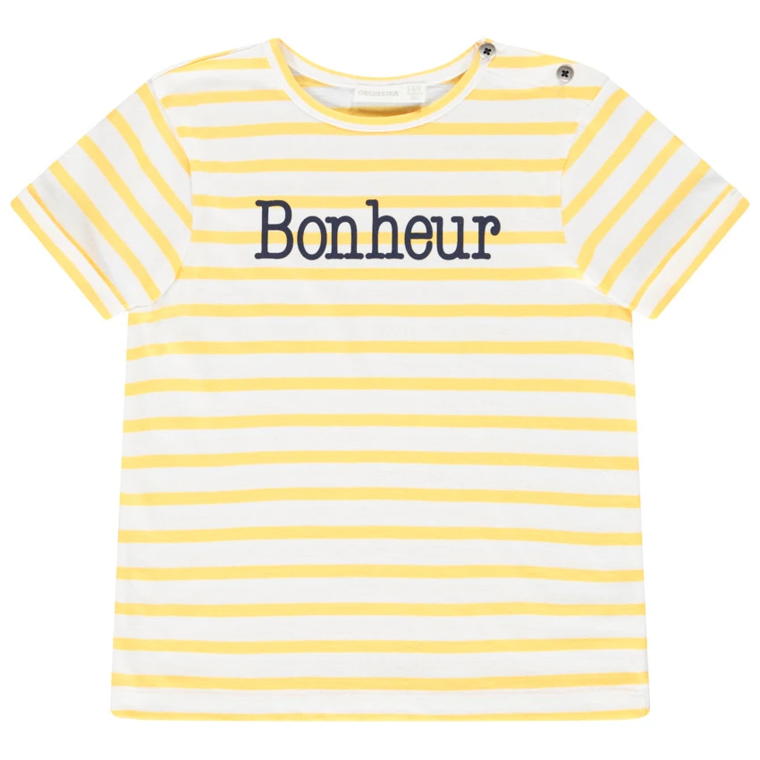 T-shirt mixte à manches courtes. Col rond. Rayures all-over. Message printé sur le devant. Tricoté en France, au sein de notre usine de Roanne.