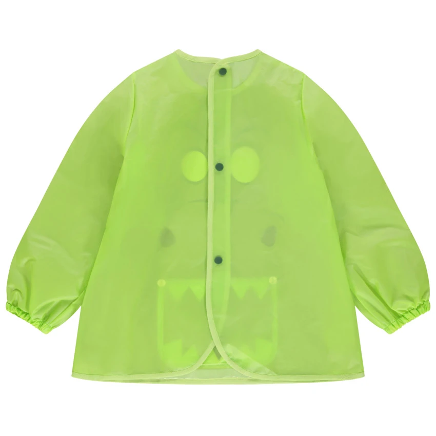 Tablier manches longues vert. Print dinosaure sur le devant avec poche plaquée. Ouverture pressionnée au dos. Bout des manches élastiqué.