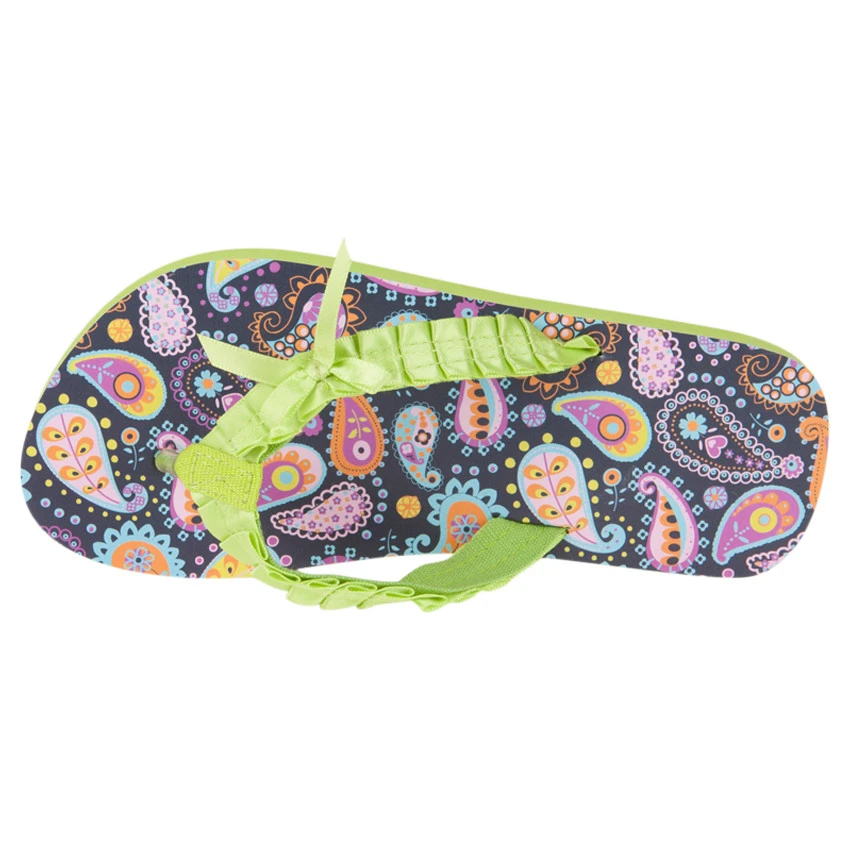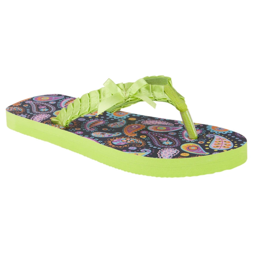 Tongs en caoutchouc coloris vert anis. Bride en tissu vert anis effet froncé et satiné sur le dessus avec noeud cousu en ton sur ton. Entre-doigt avec embout plastique transparent. Semelle intérieure contrastée, imprimé cachemire fantaisie.