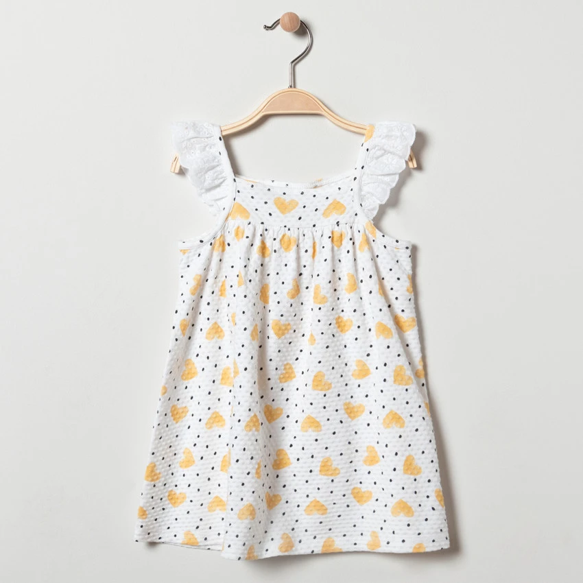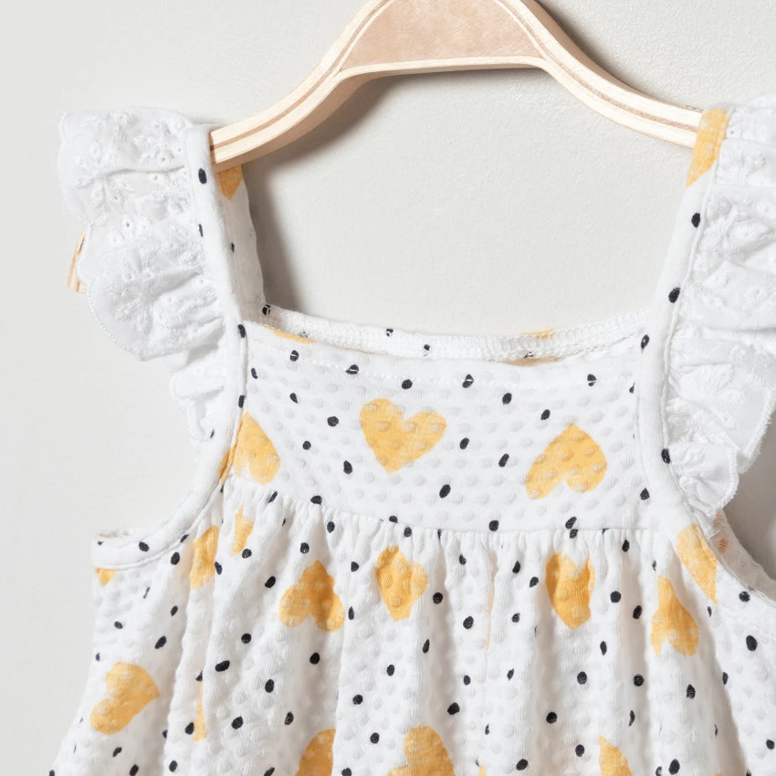 Tunique à bretelles volantées en broderie anglaise. Surpiqûre en dessous de la poitrine. Effet gaufré. Imprimé coeurs et pois all-over.