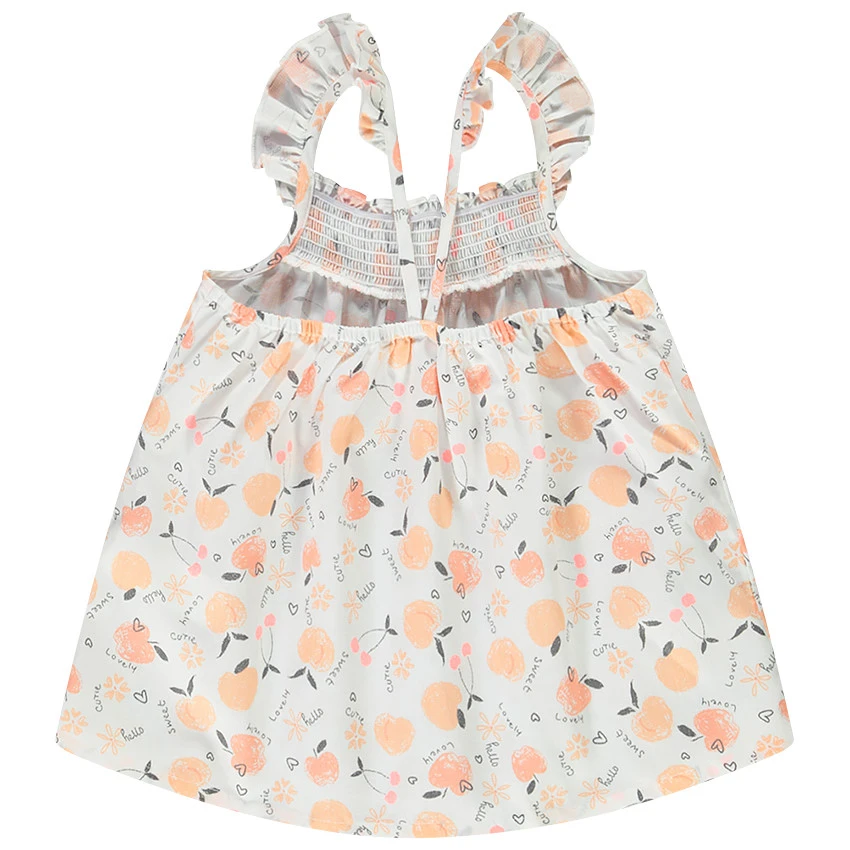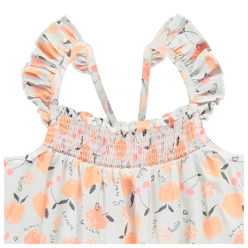 Tunique à bretelles volantées. Poitrine élastiquée. Bretelles en V dans le dos. Imprimé pêches all-over.