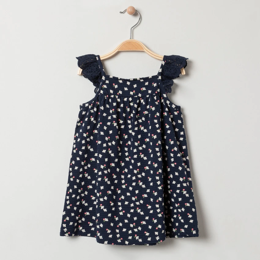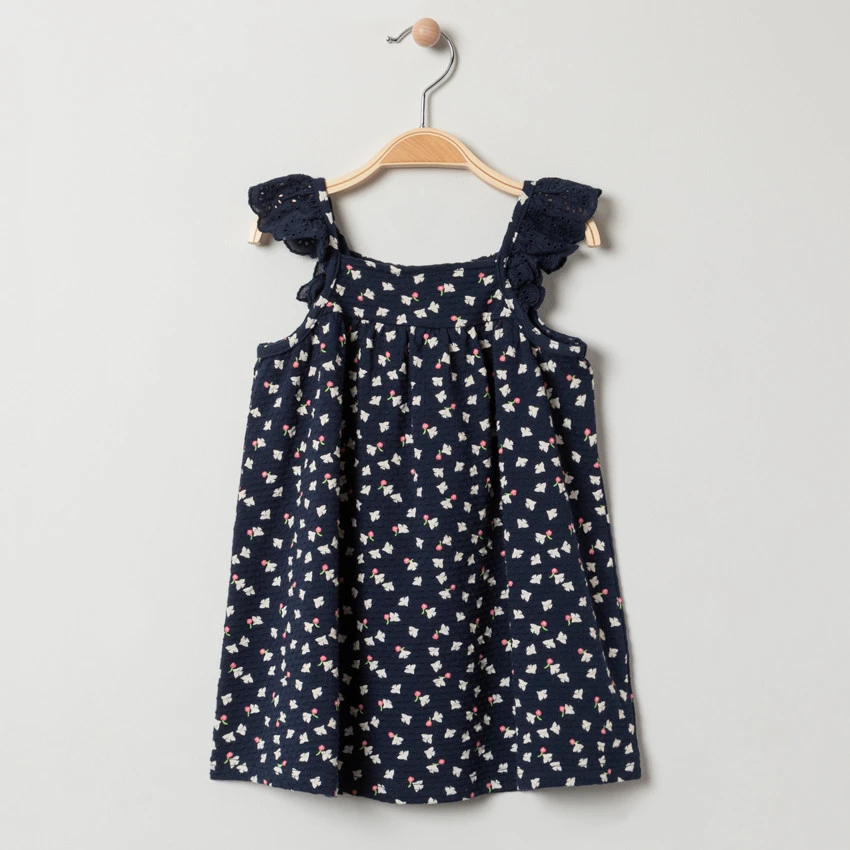Tunique en maille fantaisie. Bretelles en broderie anglaise. Colombes imprimées all-over.