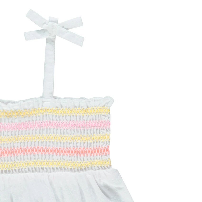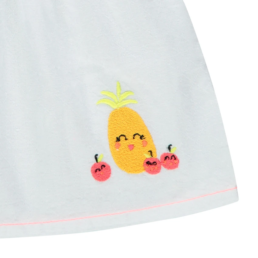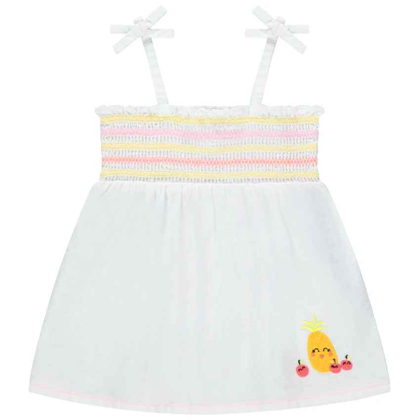 Tunique à bretelles. Nouettes sur les bretelles. Smocke coloré sur la poitrine. Fruits brodés sur le bas de la tunique .