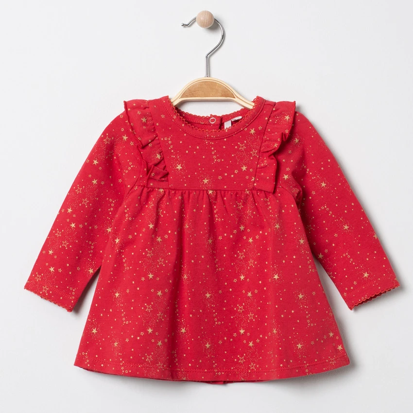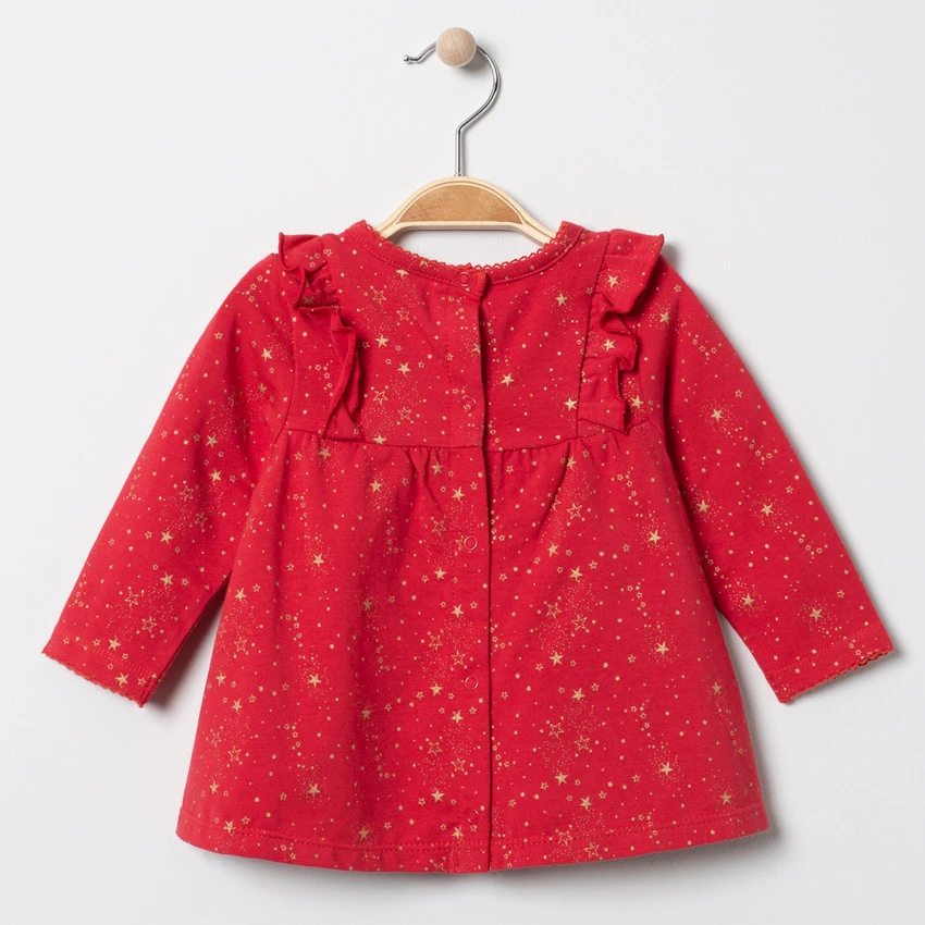 Tunique manches longues rouge. Etoiles dorées imprimées all-over. Encolure ronde. Volants sur les emmanchures. Ouverture pressionnée au dos.