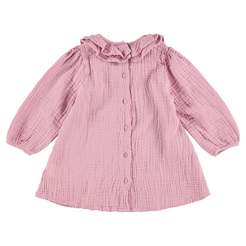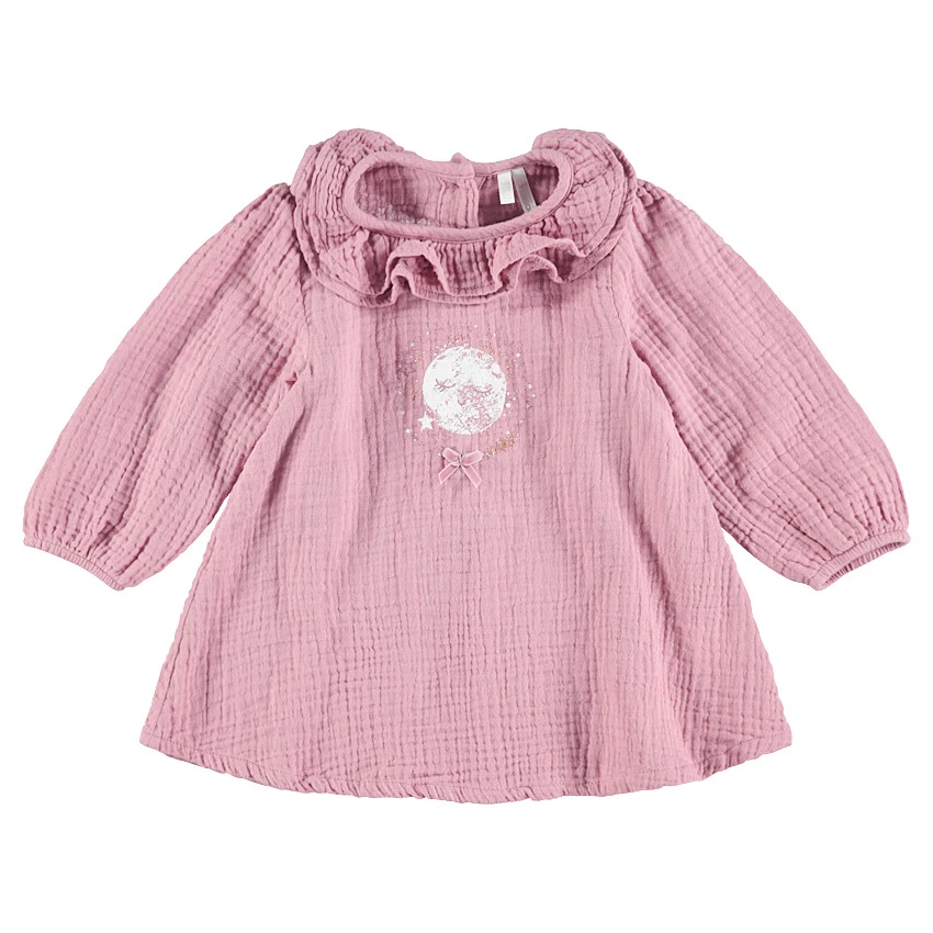 Tunique en coton tubique non doublée. Encolure avec double collerette. Manches ballon avec poignets élastiqués. Lune printée et petit noeud en velours sur le devant. Ouverture boutonnée au dos.