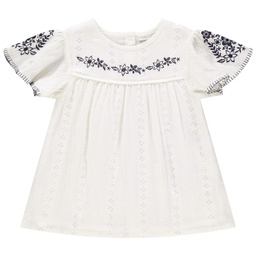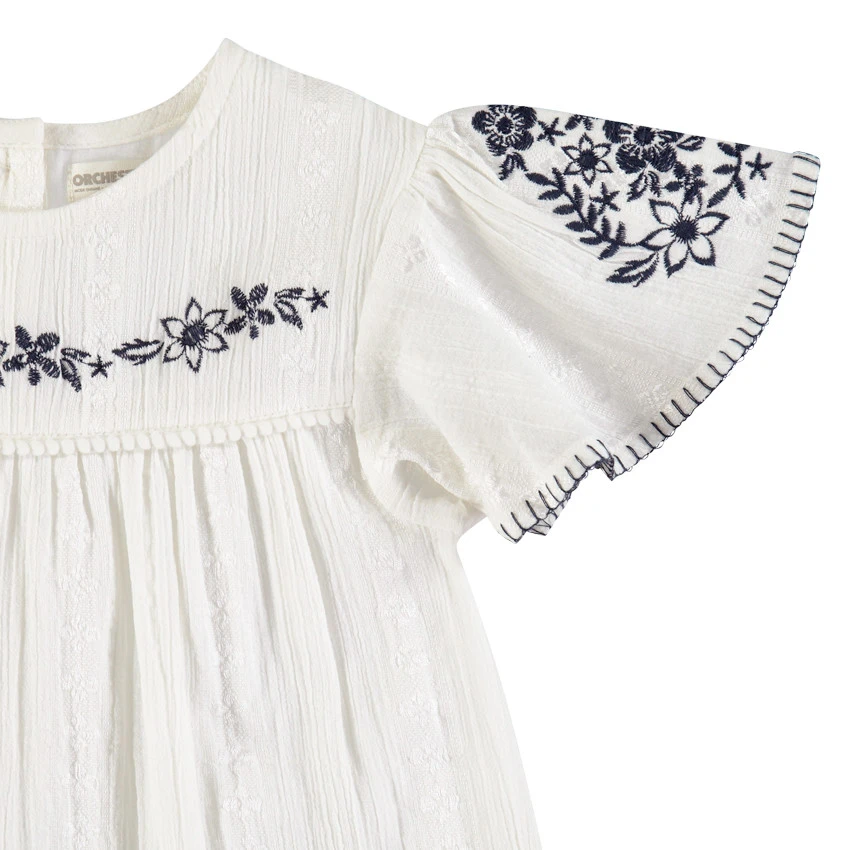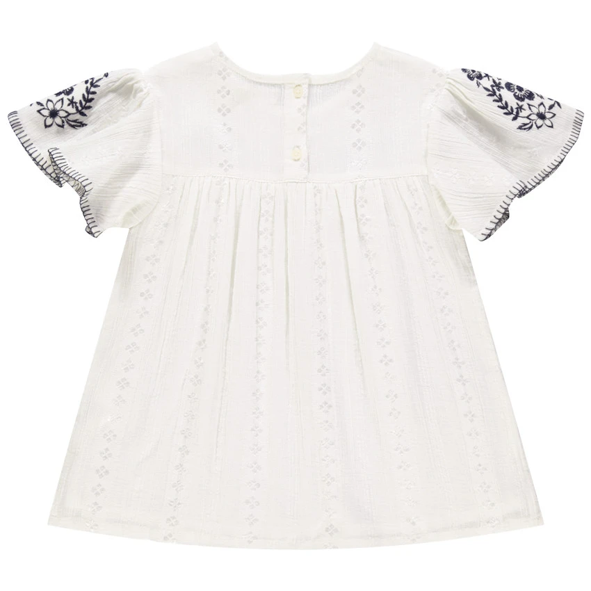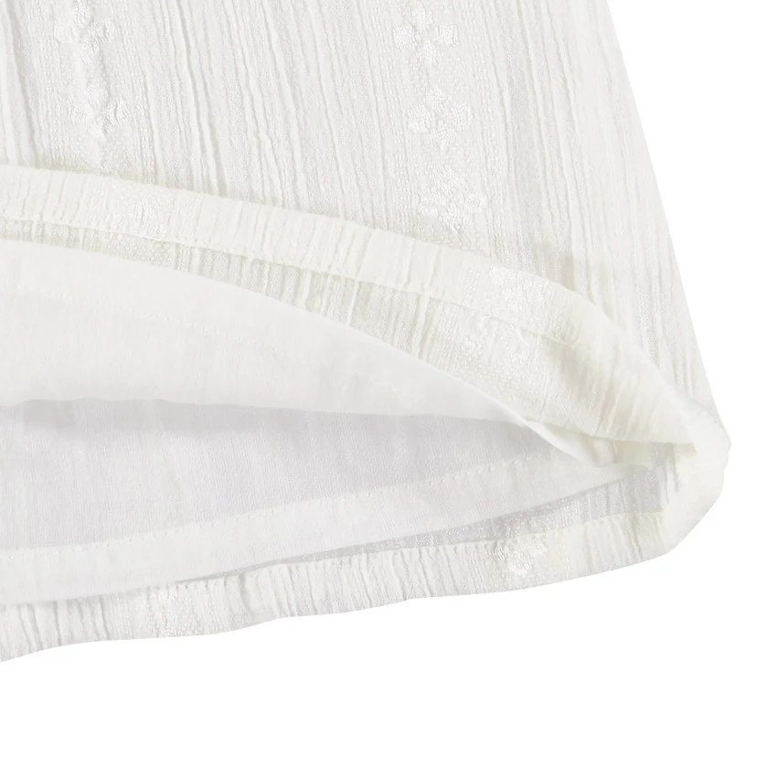 Tunique à manches volantées. Maille fantaisie. Broderies contrastées sur le haut de la tunique. Encolure ronde. Ouverture boutonnée au dos. Doublure intégrée.