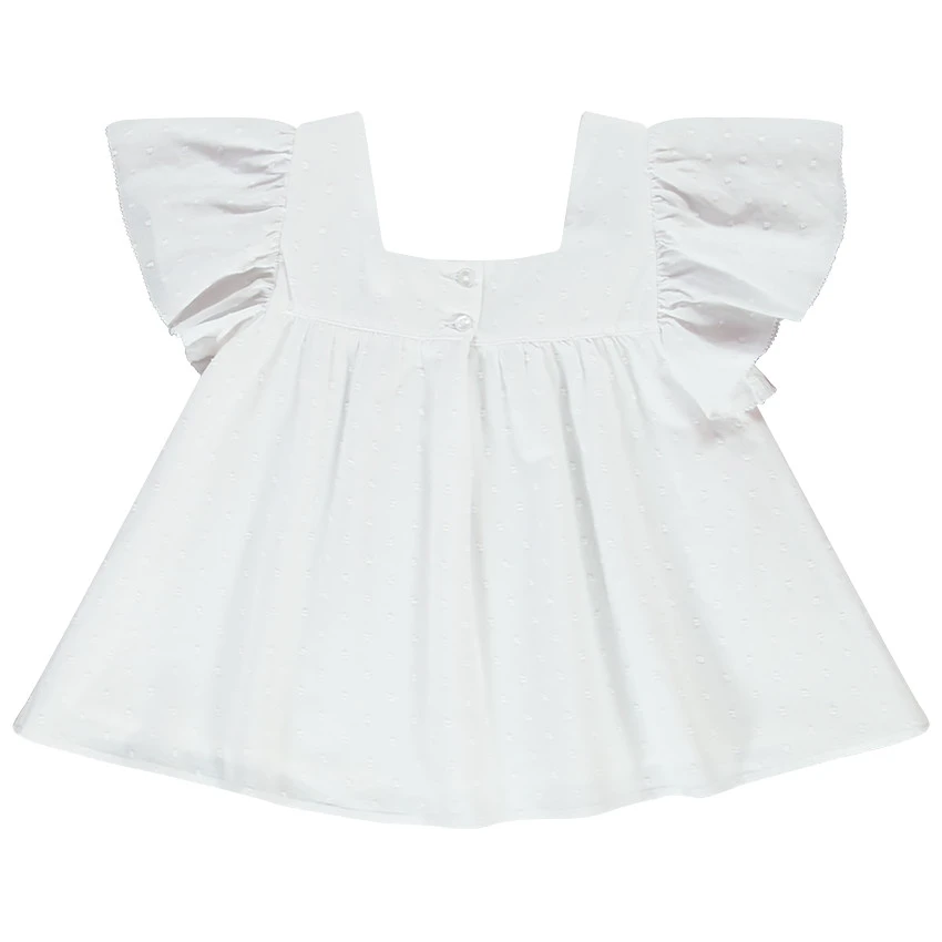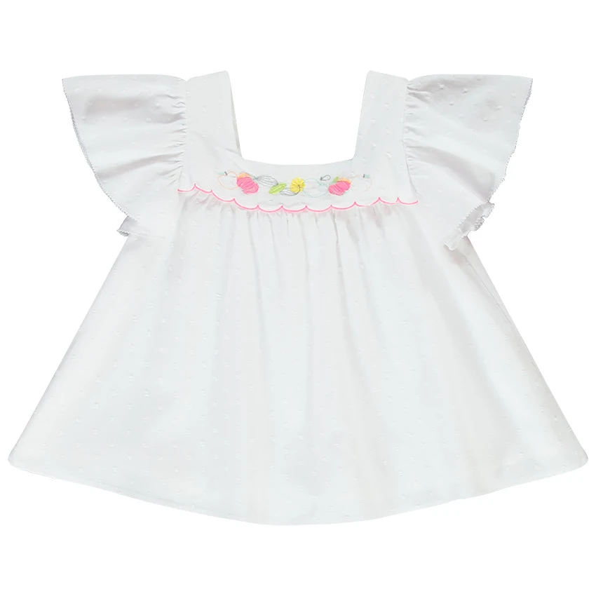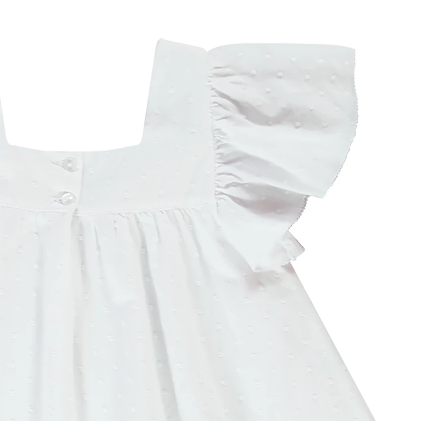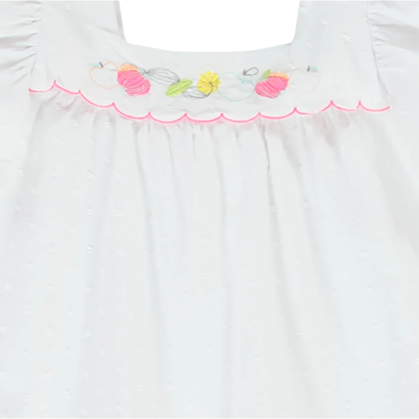 Tunique en plumetis. Encolure carrée avec broderies. Manches courtes volantées. Ouverture boutonnée dans le dos. Coupe évasée.