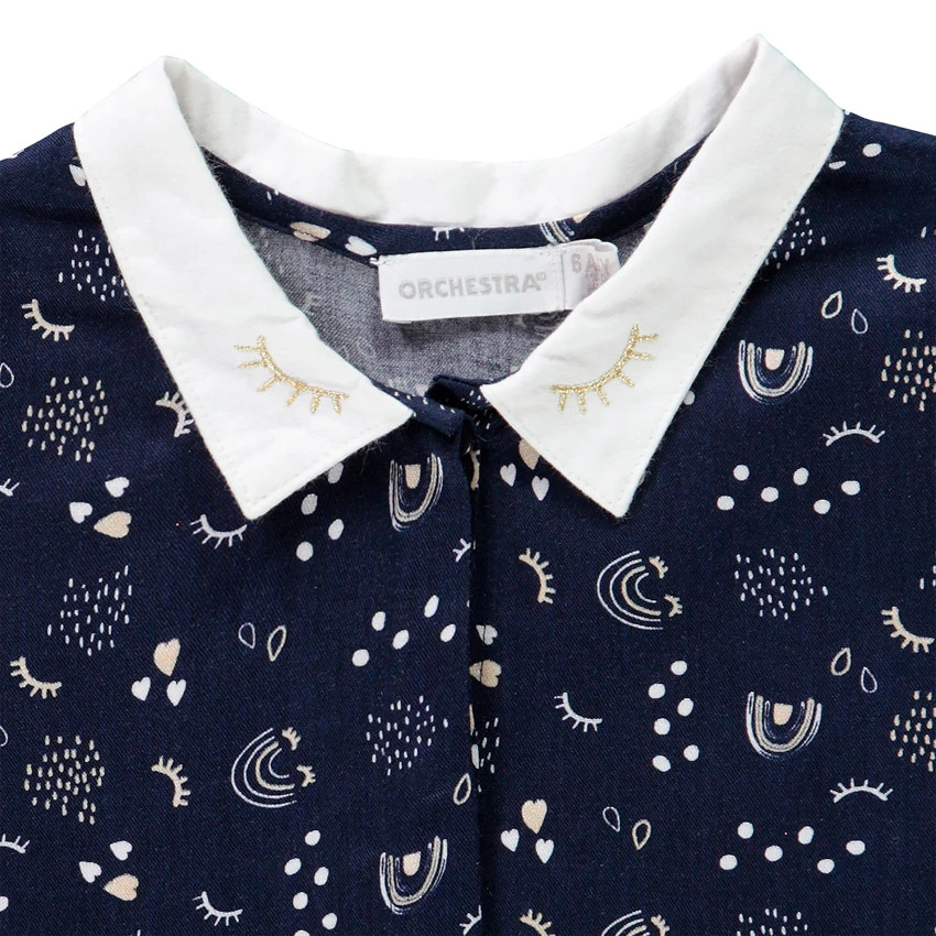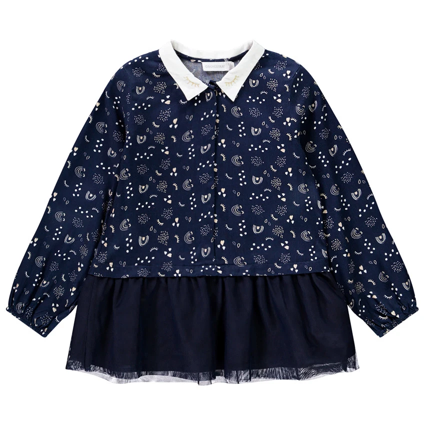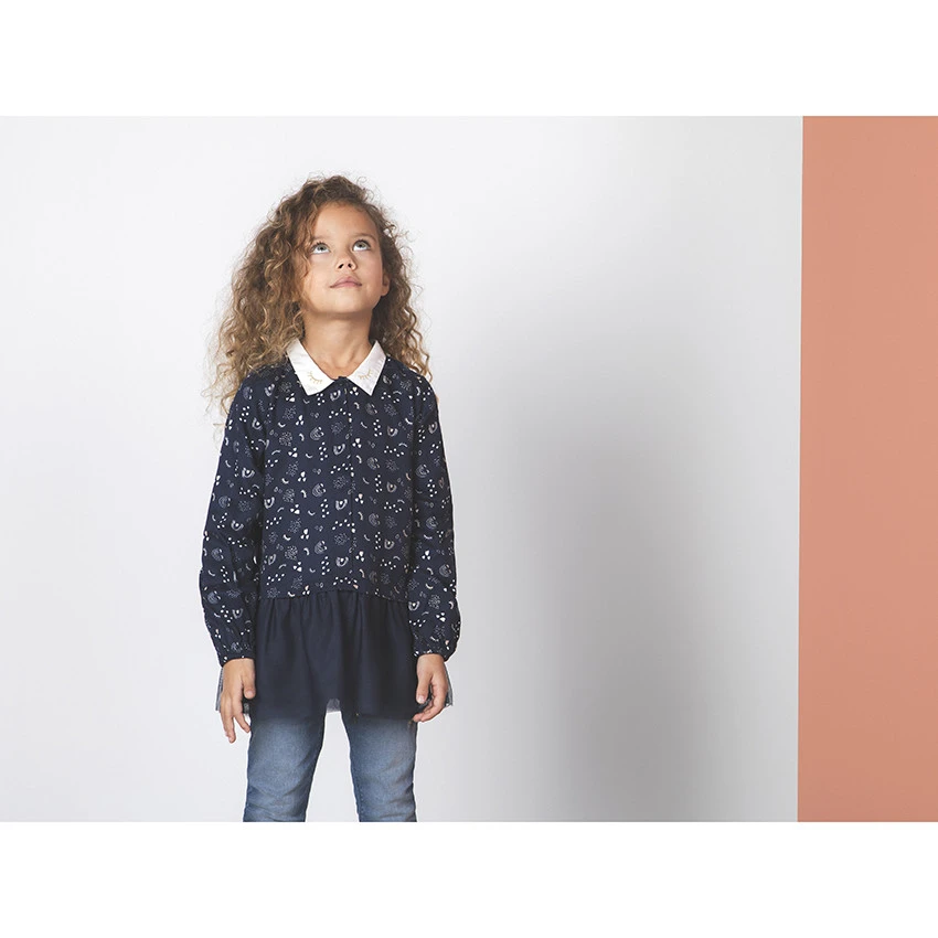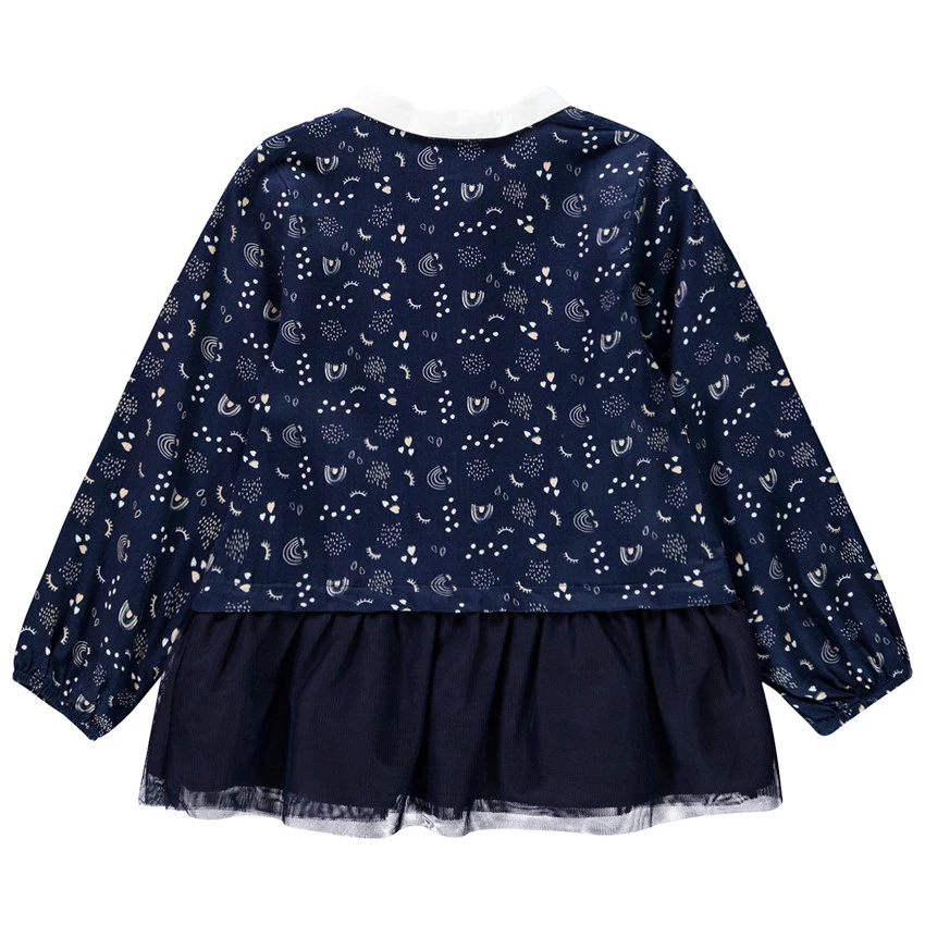 Tunique manches longues effet 2 en 1. Col fantaisie avec broderies. Ouverture sur le devant. Imprimé fantaisie. Bas de la tunique en tulle uni doublé. Bout des manches élastiqué.