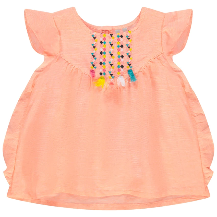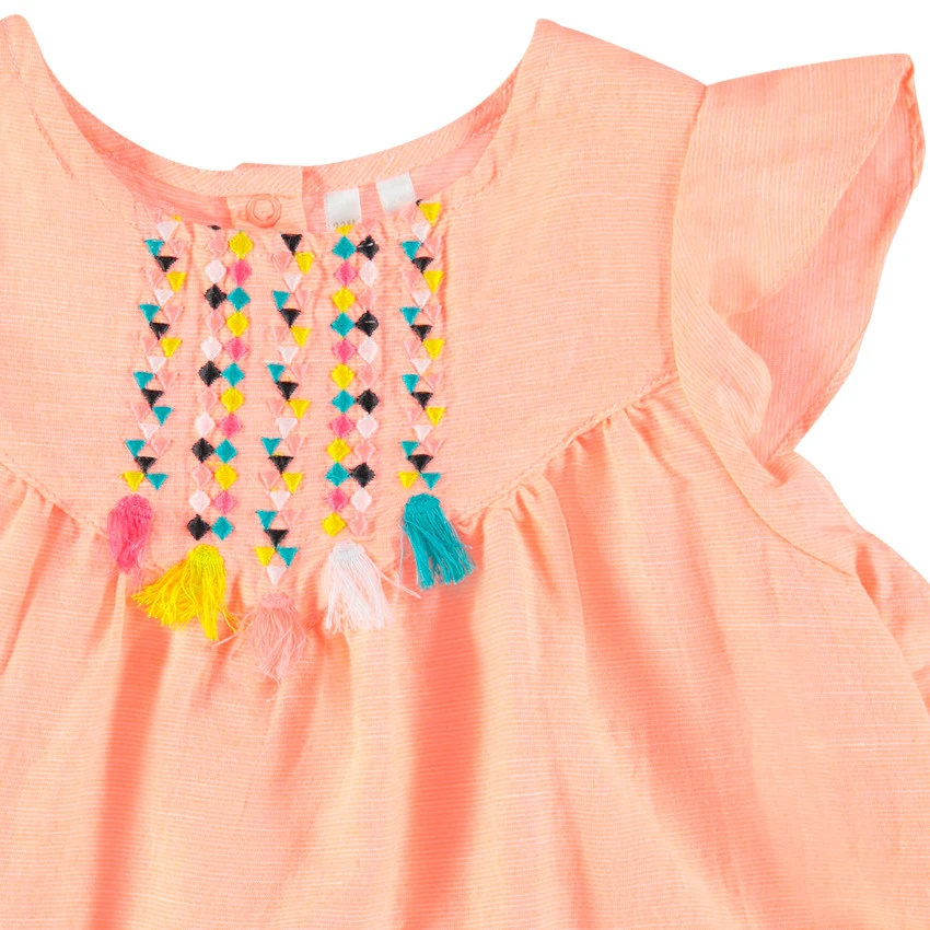 Tunique manches courtes effet slub. Broderies et pompons sous l’encolure. Ouverture pressionée au dos. Effet bouffant.