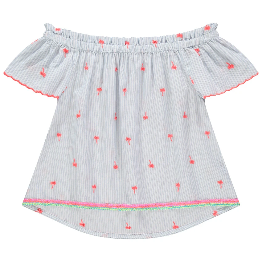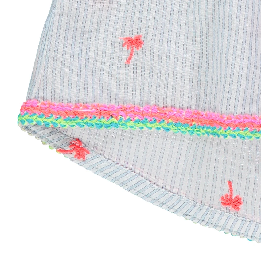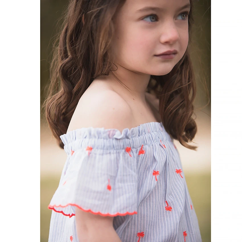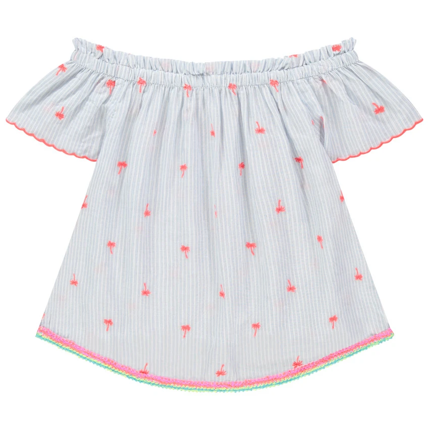 Tunique à épaules ajourées. Encolure élastiquée. Rayures verticales et palmiers imprimés en opposition. Finition festonnée sur le bout des manches. Bas de la tunique finition biais contrasté.