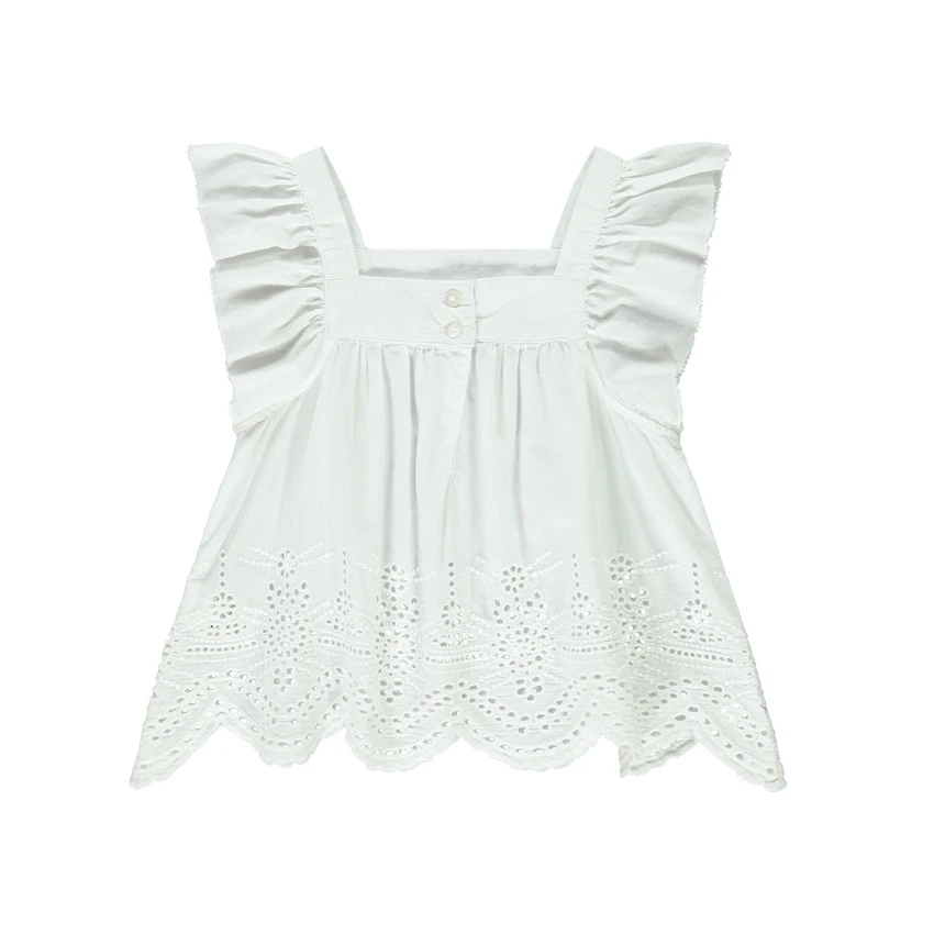 Tunique en voile de coton. Emmanchures volantées. Encolure carrée. Base évasée en broderie anglaise. Ouverture boutonnée au dos.