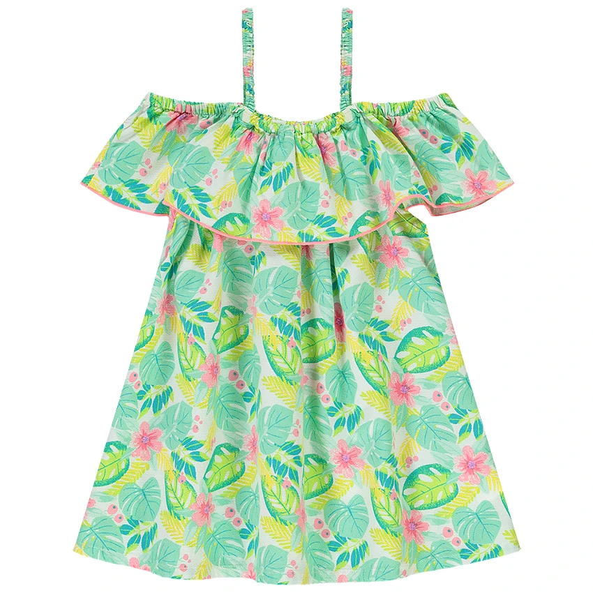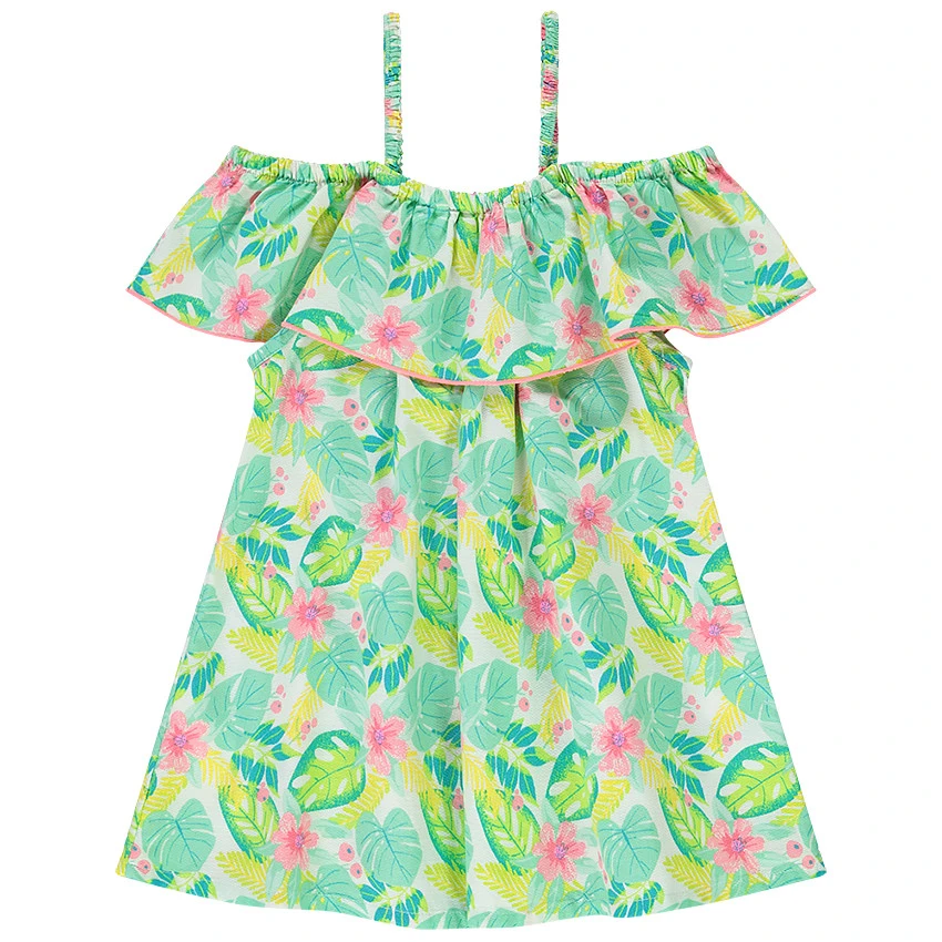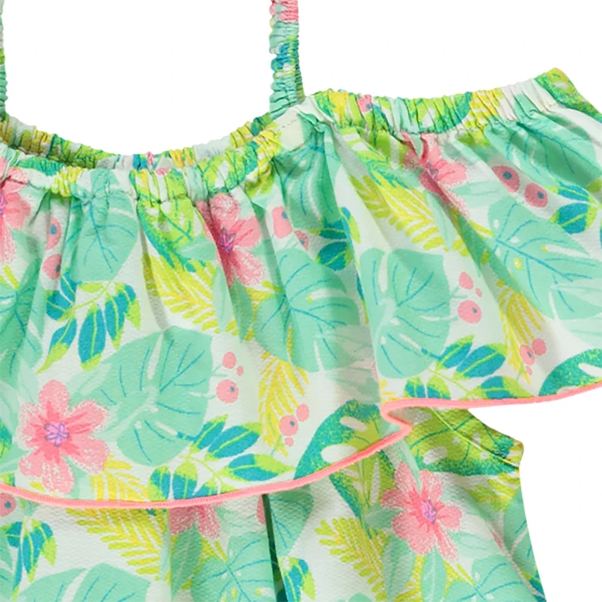 Tunique en popeline. Bretelles élastiquées. Imprimé tropical multicolore avec touches d’aqua. Empiècement volanté sur le haut. Epaules dénudées. Bas évasé.