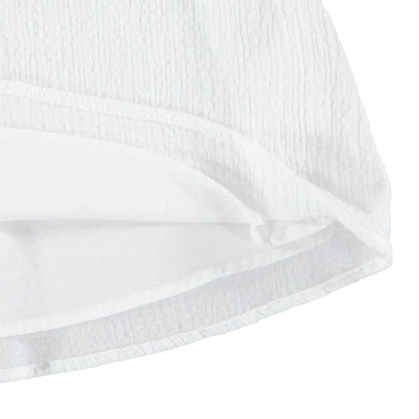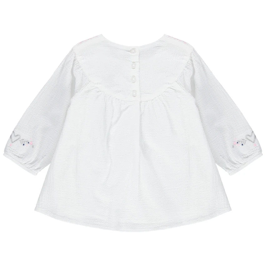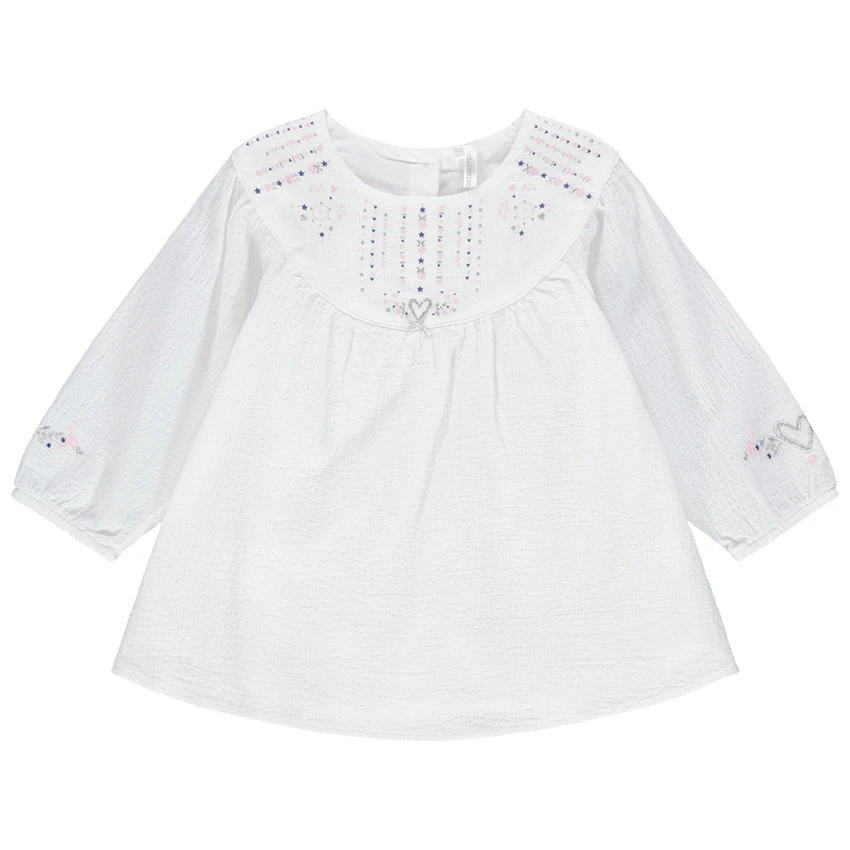 Tunique manches longues en coton crêpe. Encolure ronde avec petits imprimés brillants. Doublure intégrée. Ouverture boutonnée au dos.