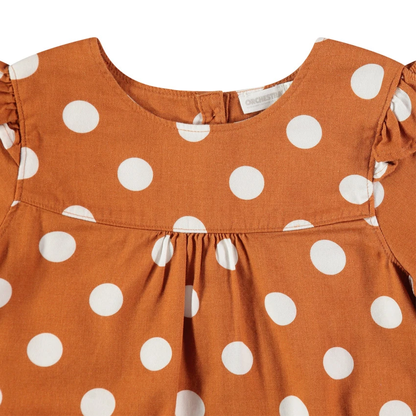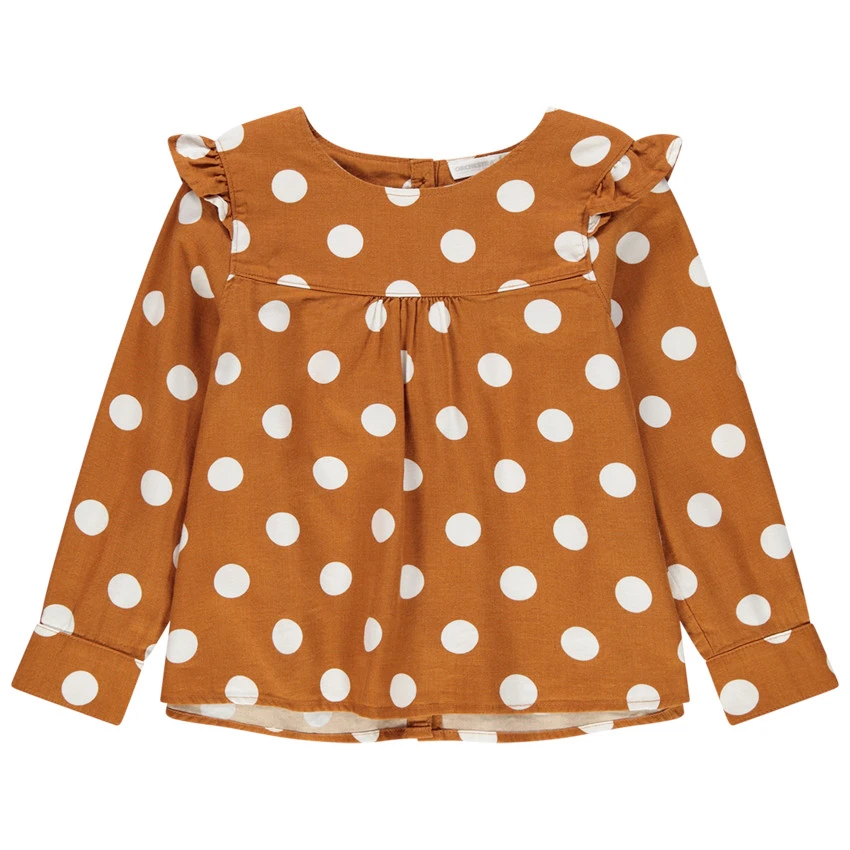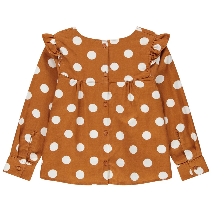 Tunique manches longues à pois contrastés. Encolure ronde. Volants sur les emmanchures. Ouverture boutonnée au dos. Poignets boutonnés.