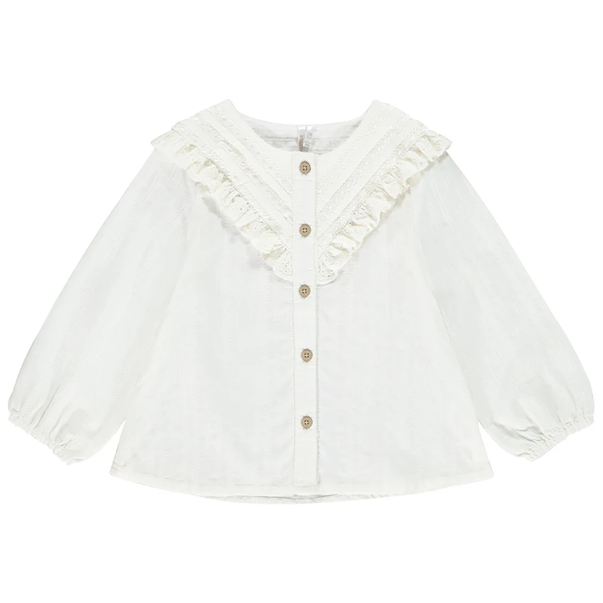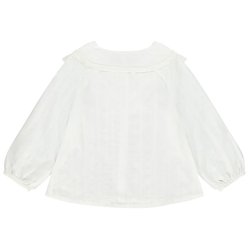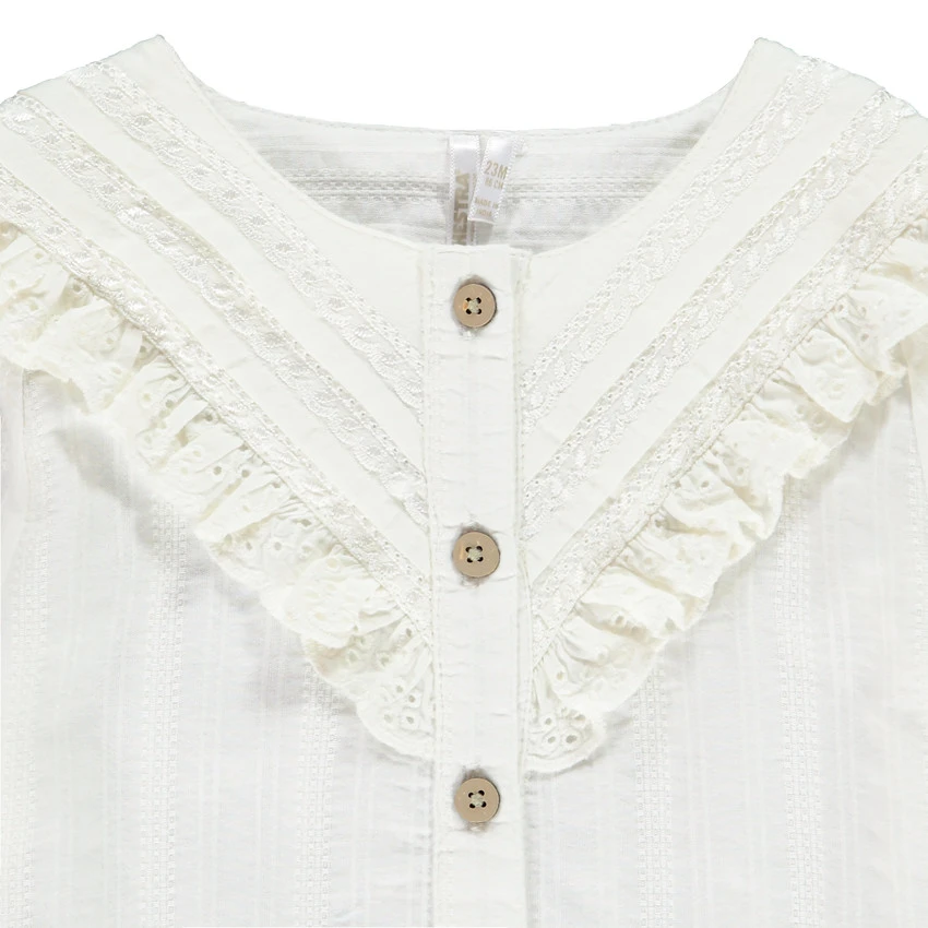 Tunique manches longues en maille fantaisie. Ouverture boutonnée sur le devant. Empiècement en broderie anglaise sur le haut du gilet. Manches ballon. Coupe évasée sur le bas.
