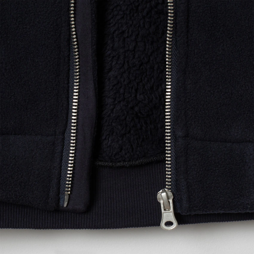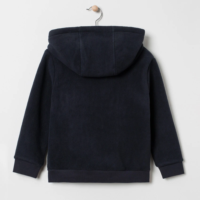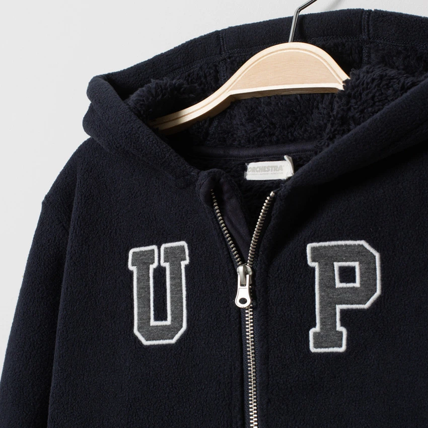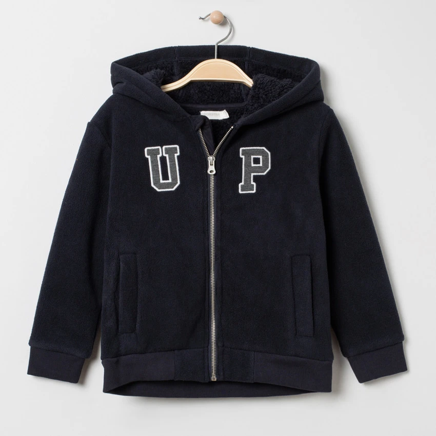 Veste à capuche en molleton. Doublure en sherpa. Lettres brodées sur le devant. 2 poches passepoilées devant. Poignets et base en bord-côte.