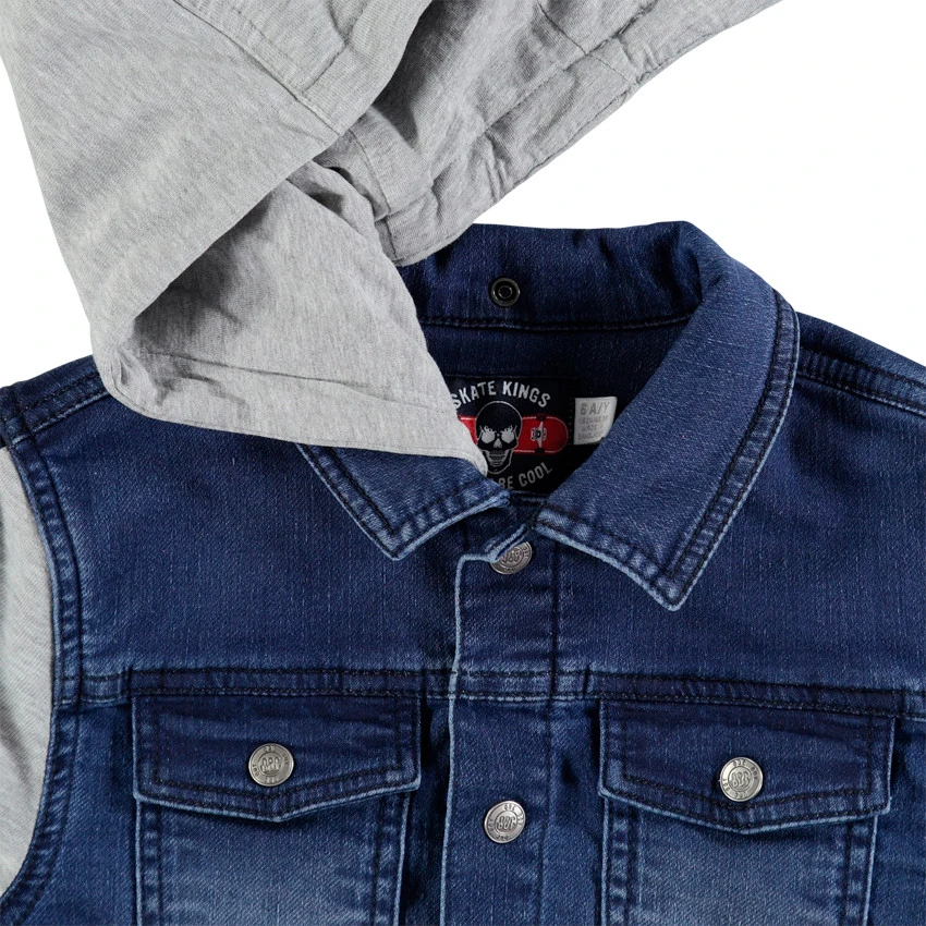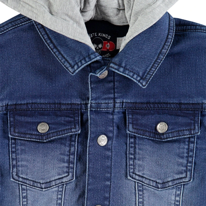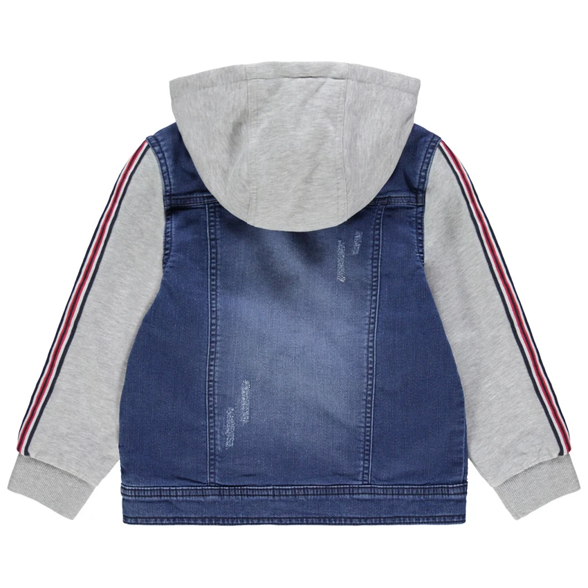 Veste bi-matière. Capuche amovible par pressions. Ouverture pressionnée sur le devant. 2 poches à rabat pressionné sur la poitrine. Bandes appliquées sur les manches. 2 poches coupées devant.