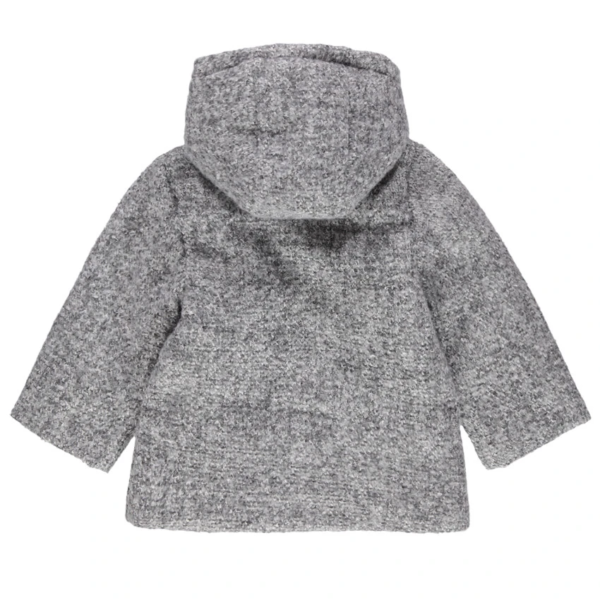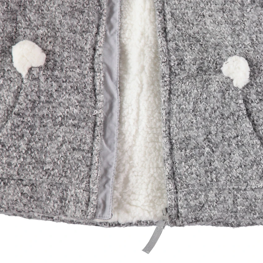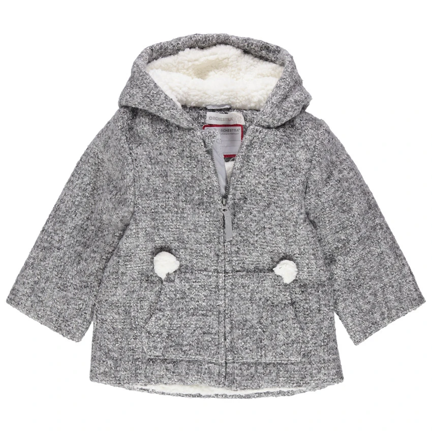 Veste en maille fantaisie à capuche. Doublure sherpa. Ouverture zippée devant. 2 poches forme kangourou avec pompons.