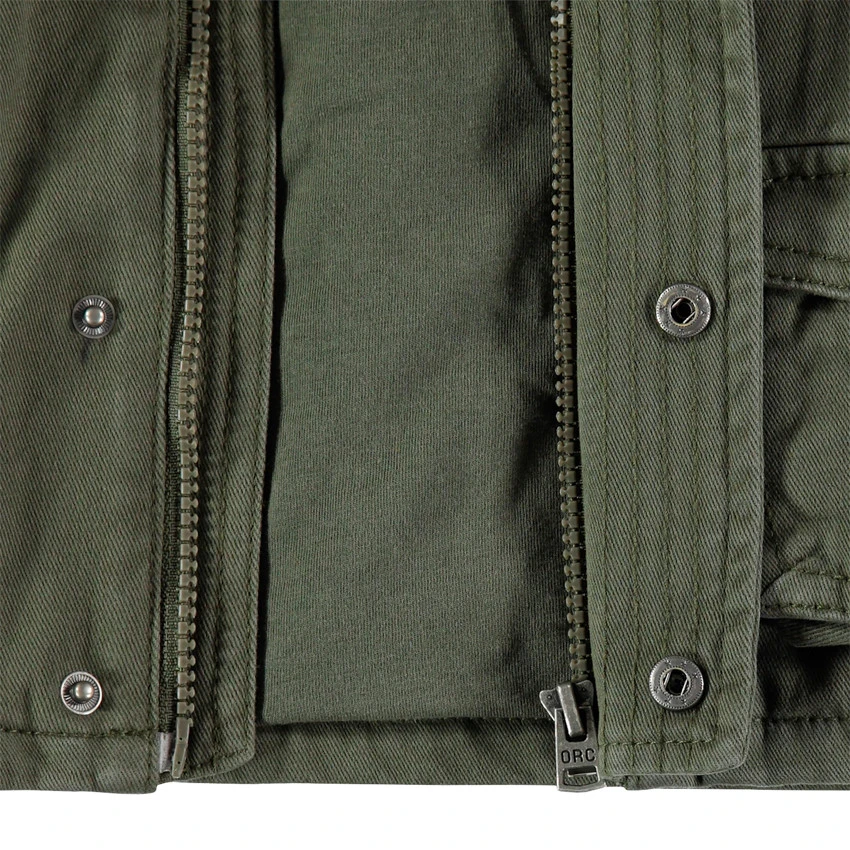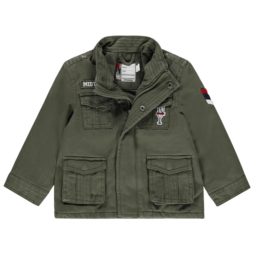 Veste en toile. Col haut. Ouverture zippée et pressionnée sous patte. 2 poches à rabat avec inscription printée et galon brodé sur la manche gauche. Poignets boutonnés.