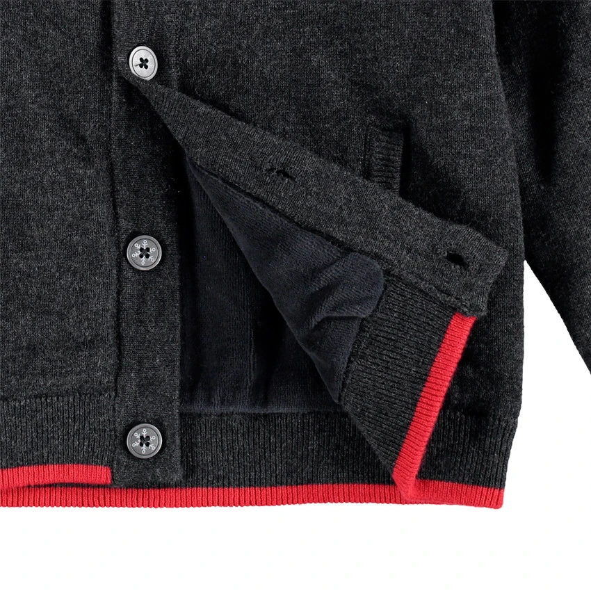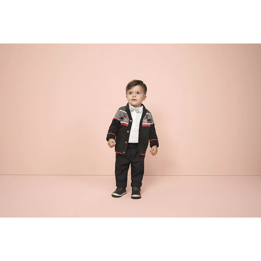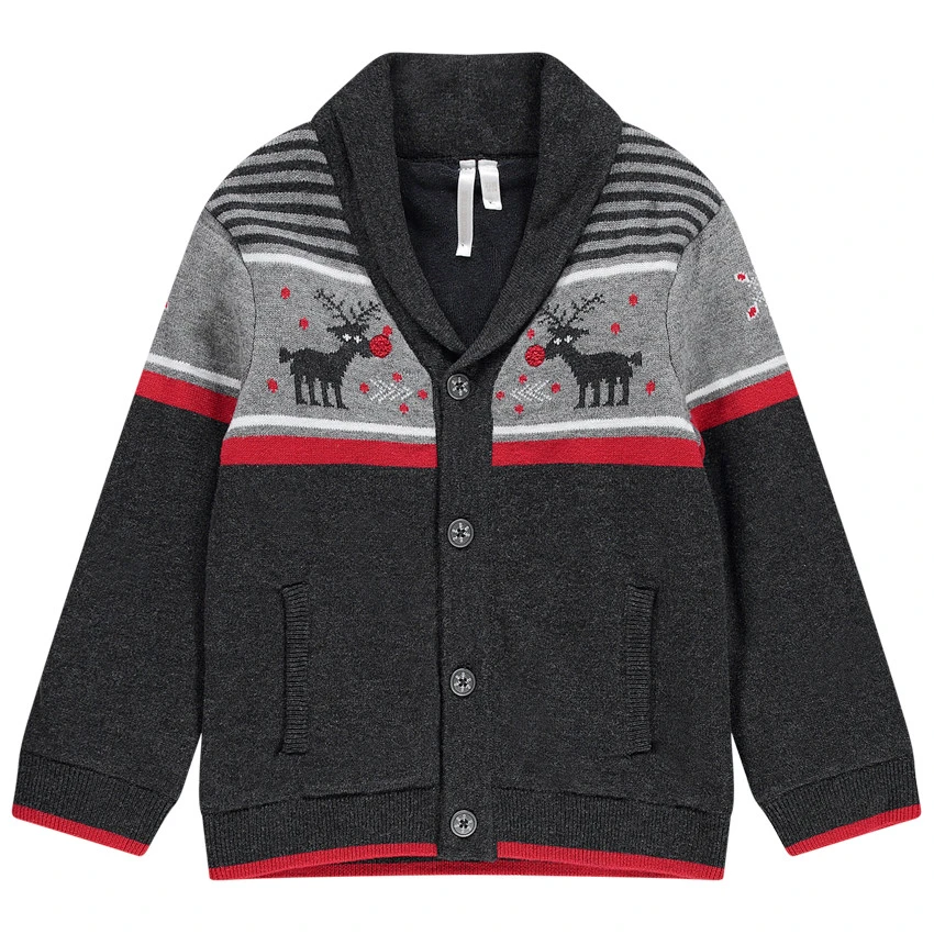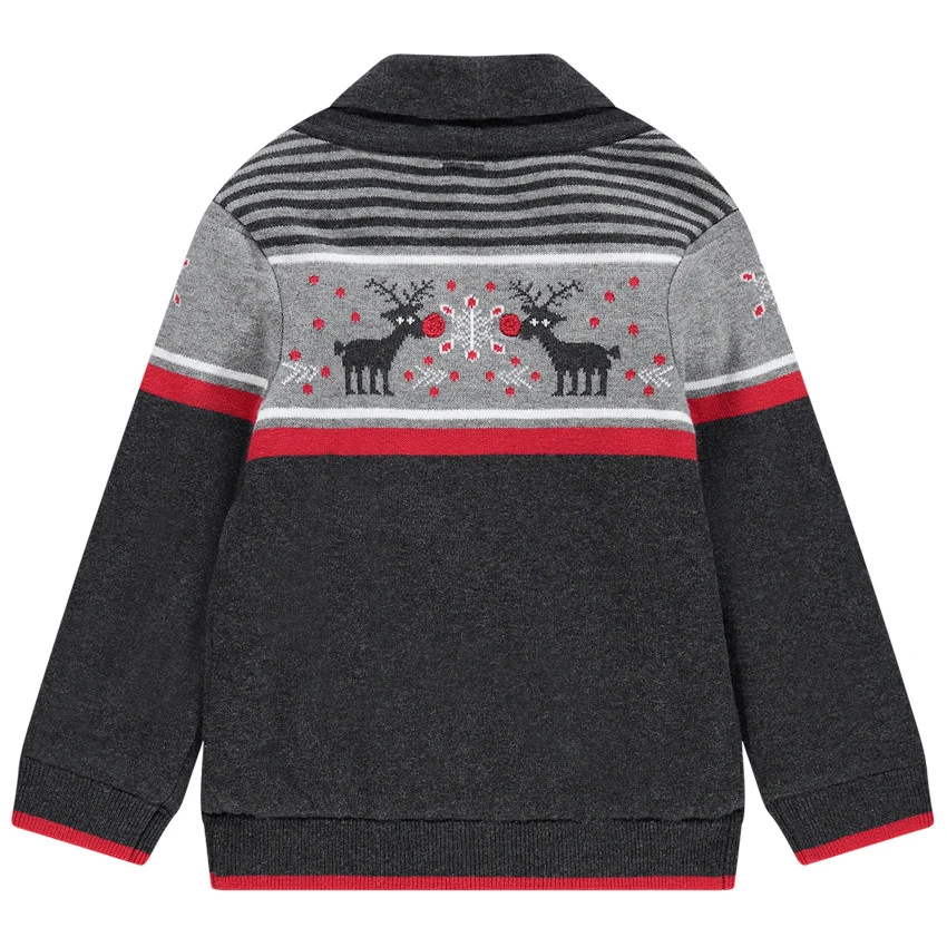 Veste en tricot chiné. Doublure en velours. Col châle. Ouverture boutonnée devant. Cerfs en jacquard. Poches en bord-côte. Poignets et base en bord-côte.