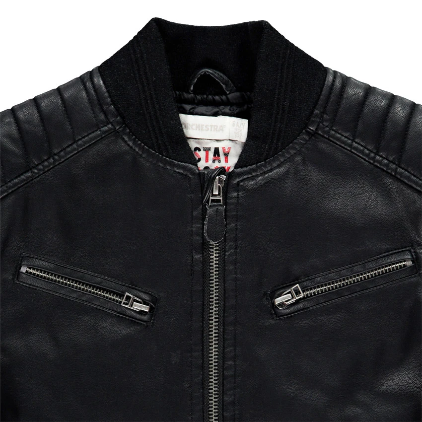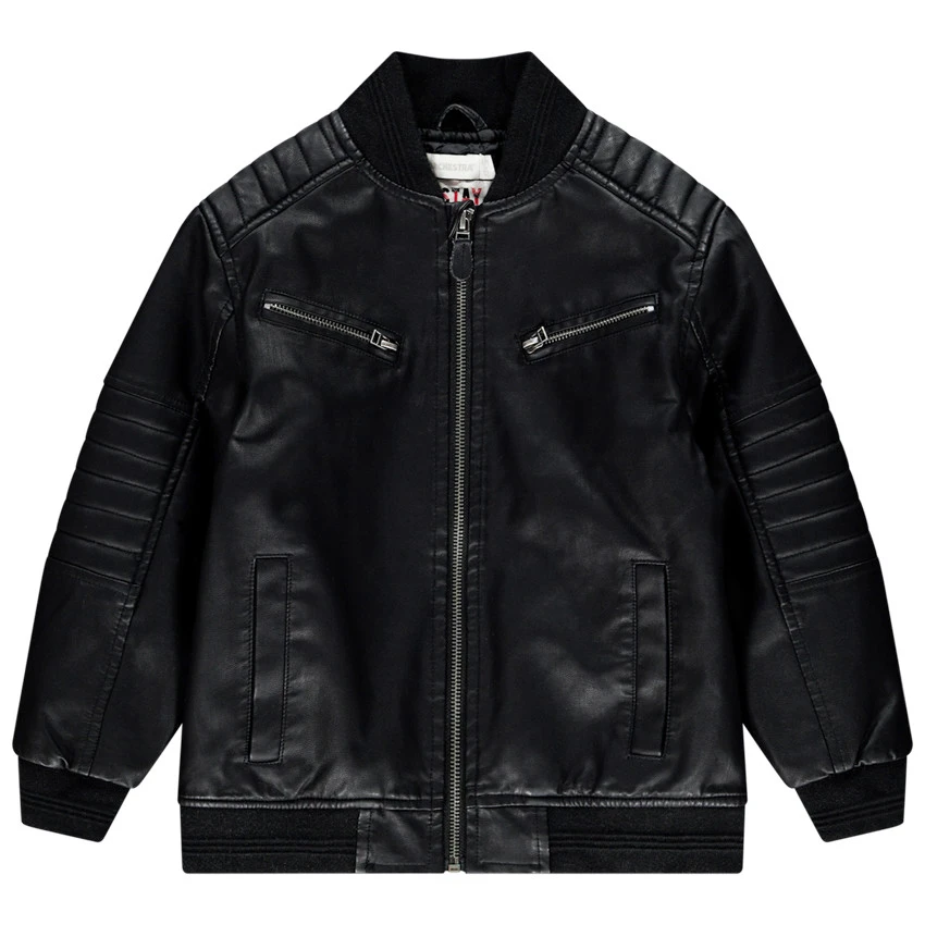 Veste imitation cuir. Col style teddy. 2 poches zippées sur la poitrine. Ouverture zippée. 2 poches passepoilées. Poignets et bas élastiqués.