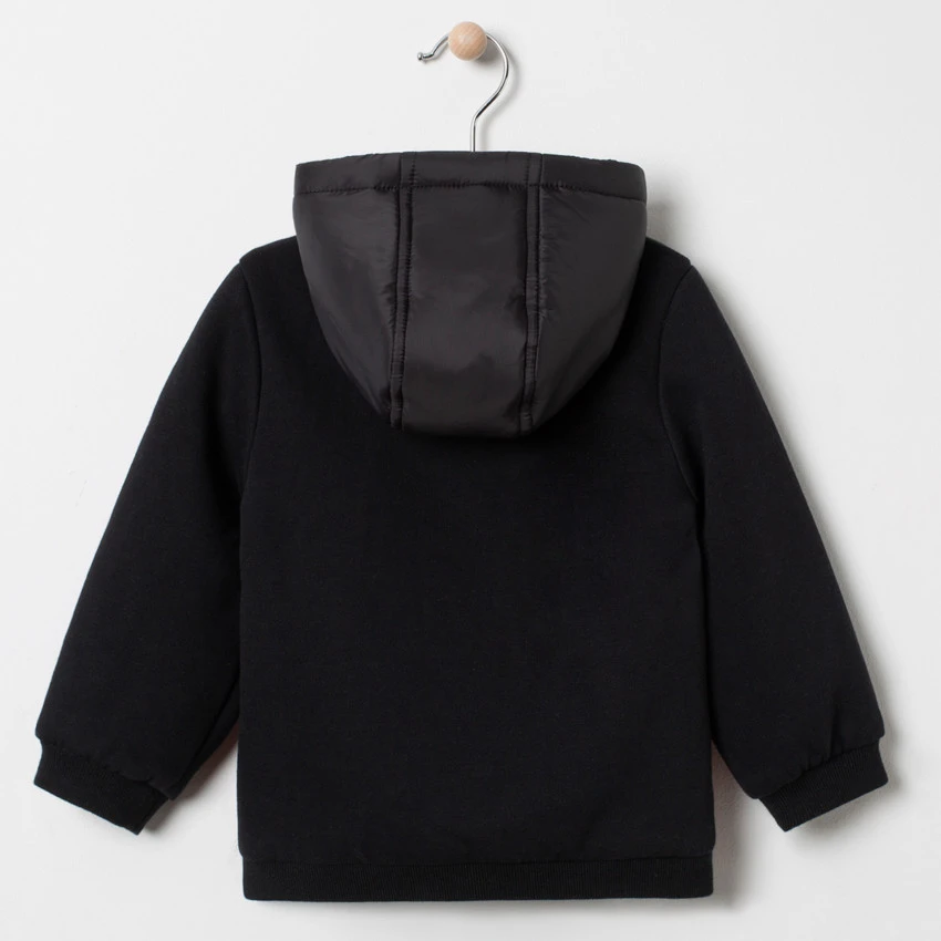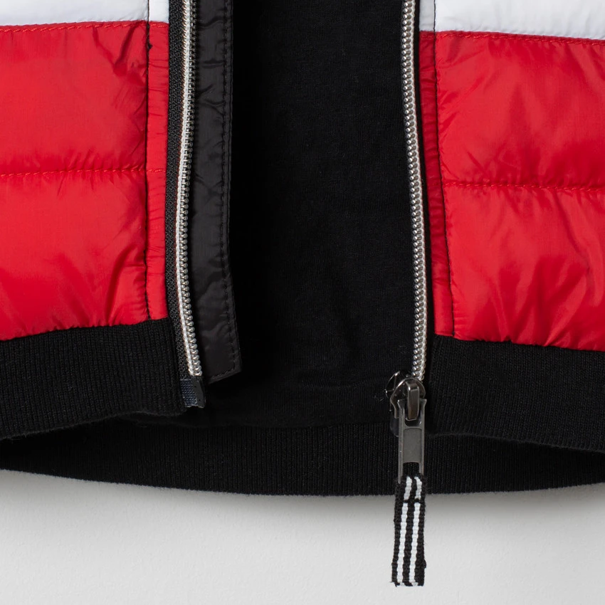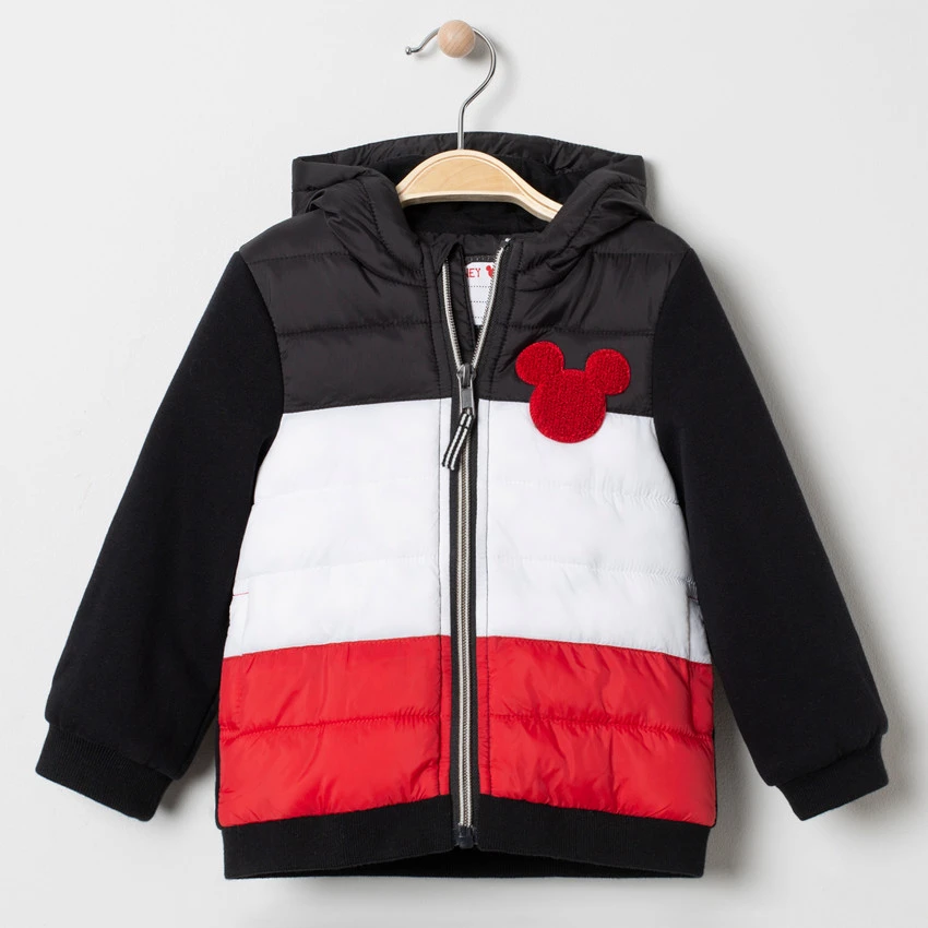 Veste matelassée bi-matière à capuche. Ouverture zippée sur le devant. Mickey brodé sur la poitrine. 2 poches coupées. Poignets et base en bord-côte. Manches en molleton.
