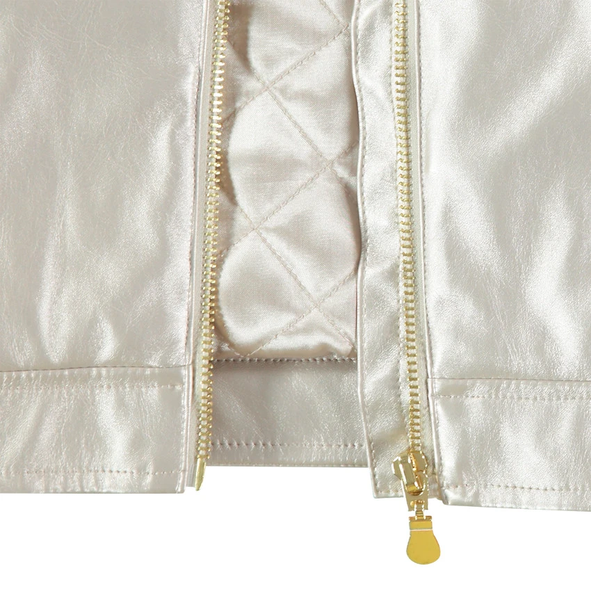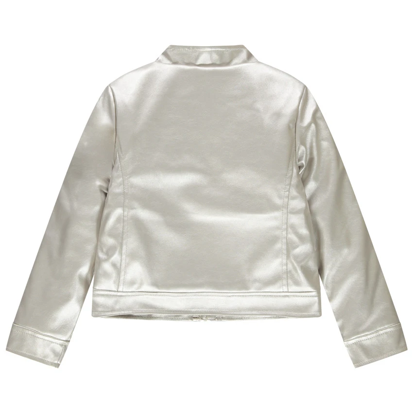 Veste style motard argentée. Col motard. Ouverture zippée devant. 2 poches zippées devant. Finitions dorées en métal. Doublure en satin à croisillons.